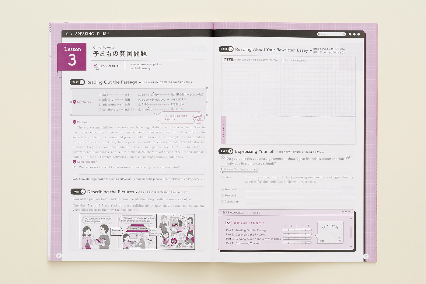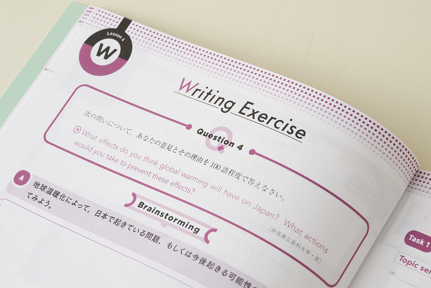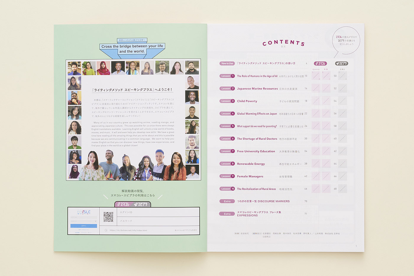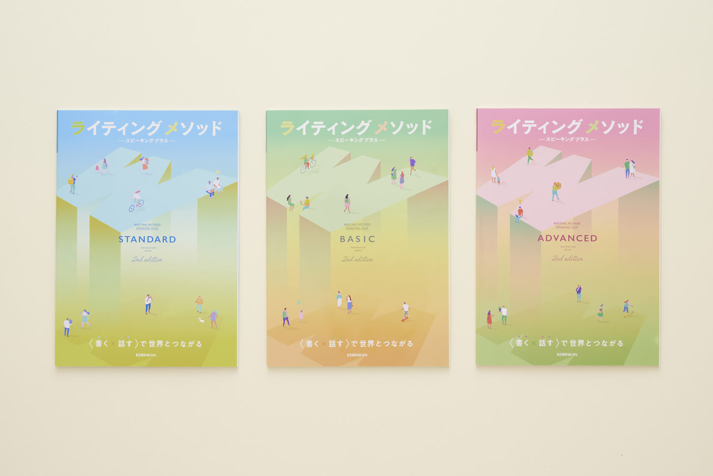 高校生の英語教材「ライティングメソッド」のリニューアルデザインをおこないました。前回に引続き今回も弊社で制作を担当、約5年ぶりに一新です。キャッチコピーにあるように「世界とつながる」を連想したビジュアルに仕上げました。表紙、巻頭、中面ページのフォーマットデザイン、奥付けまで全てを手がけています。